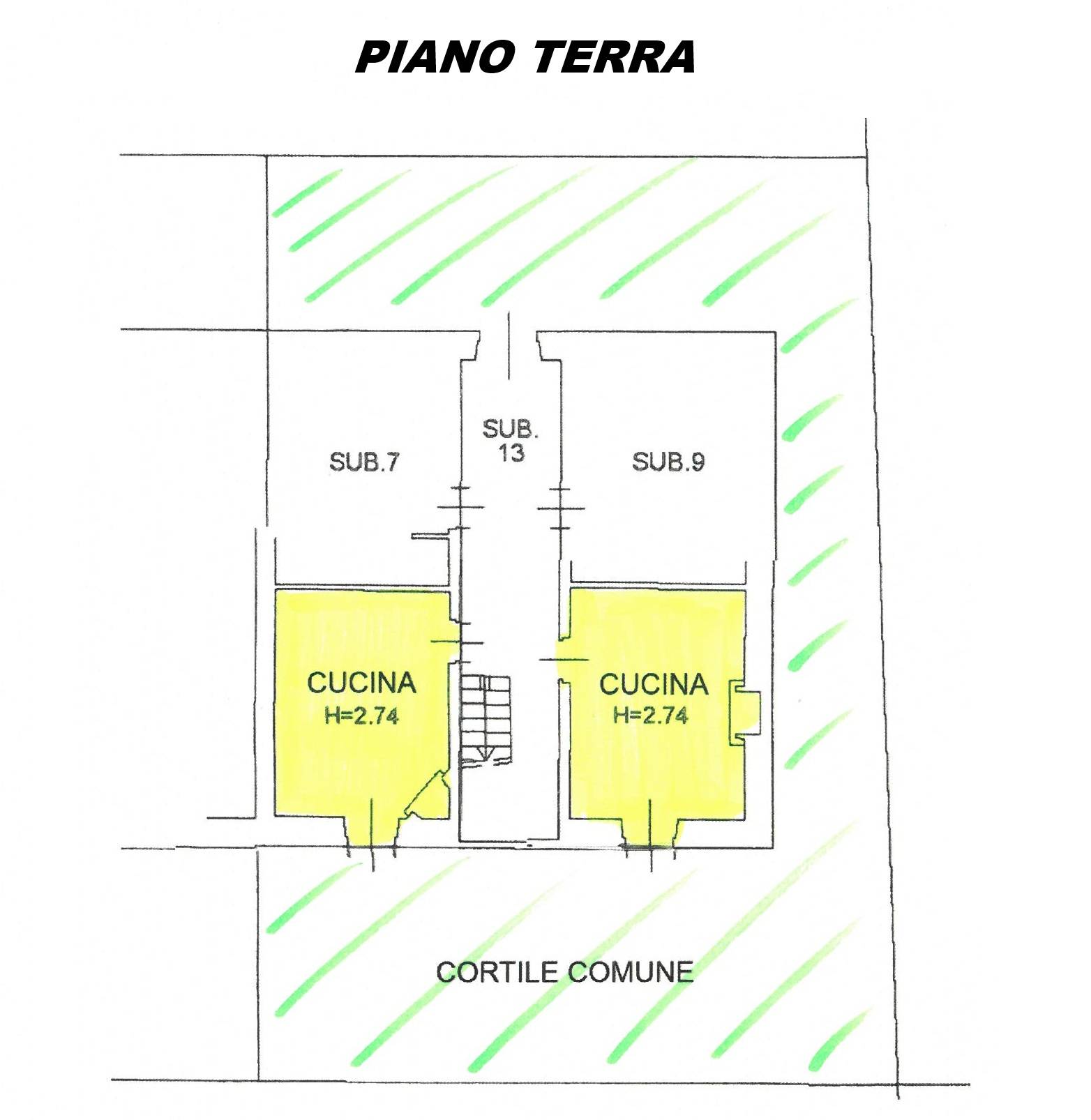 2 cucine (corridoio comune centrale con giroscale di collegamento ai piani, che scollega i locali i quali risultano collegabili terra-tetto solo verticalmente); uscite sull’esterno verso giardino privato;