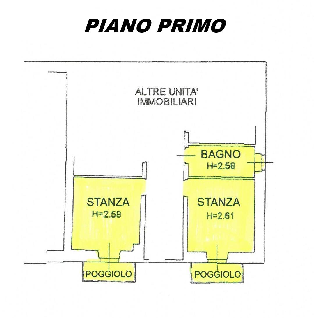 2 stanze, bagno, 2 poggioli; (corridoio comune centrale con giroscale di collegamento ai piani, che scollega i locali i quali risultano collegabili terra-tetto solo verticalmente);