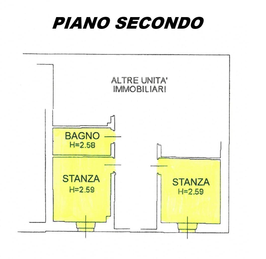 2 stanze, bagno; (corridoio comune centrale con giroscale di collegamento ai piani, che scollega i locali i quali risultano collegabili terra-tetto solo verticalmente);