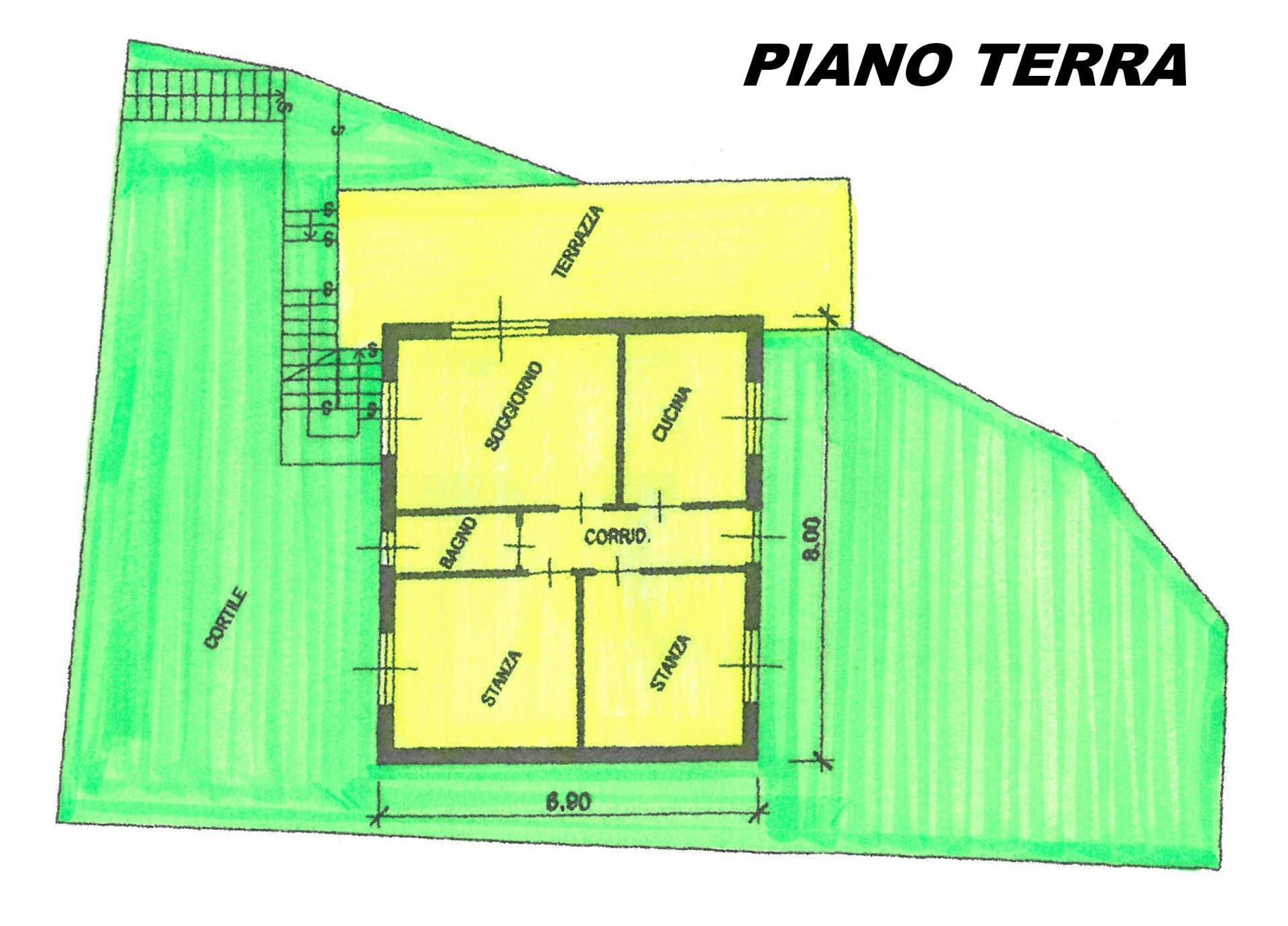 doppio accesso pedonale, uno dalla strada interna del paese con scaletta privata, altro sul fronte anche carrabile. Giardino privato circostante di tot. circa 150/200mq.